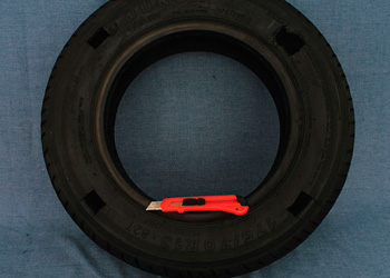 1 – Lave os pneus com água e sabão. Com o estilete, corte quatro quadrados na parte funda do pneu, distribuindo-os nos quatros lados opostos, em formato de cruz. Os cortes servirão como um sistema de drenagem para não acumular água. Repita o procedimento no outro pneu.