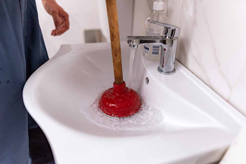 Desentupindo pia com desentupidor vermelho