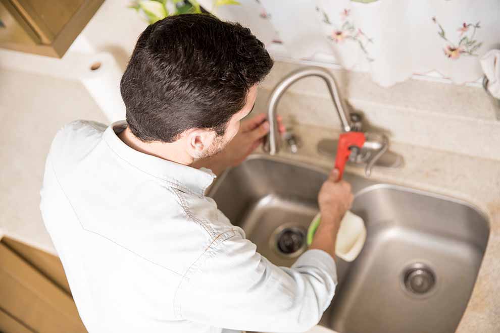 Homem consertando encanamento embaixo da pia